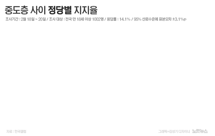 한국갤럽이 지난 18일부터 20일까지 전국 만 18세 이상 유권자 1002명을 대상으로 실시한 여론조사(95% 신뢰수준에 표본오차 ±3.1%p, 응답률 14.1%) 결과, 중도층 사이 정당별 지지율은 국민의힘 22%, 더불어민주당 42%, 무당층 28%였다. 직전 조사와 비교해 국민의힘은 중도층에서 10%p 빠졌고, 민주당은 5%p 늘었다(자세한 내용은 중앙선거여론조사심의위원회 참조).