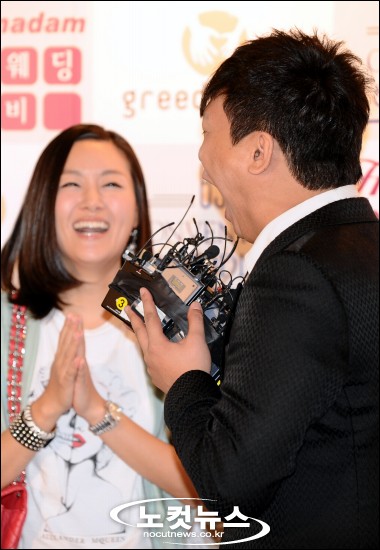 [BestNocut_R]개그맨 박준형이 13일 오후 서울 여의도 63시티에서 예정된 개그맨 정형돈과 4살 연하의 방송작가 한유라씨의 결혼식에 참석, 축하의 의미로 인터뷰용 마이크를 갈고 있다.