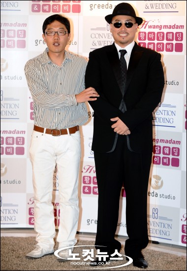 [BestNocut_R]방송인 김재동과 무한도전 팀의 길(길성준)이 13일 오후 서울 여의도 63시티에서 예정된 개그맨 정형돈과 4살 연하의 방송작가 한유라씨의 결혼식에 참석, 취재진을 향해 포즈를 취하고 있다.