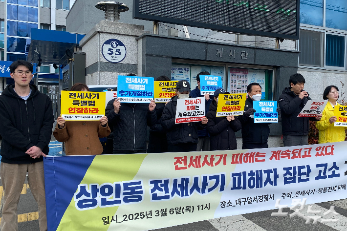이날 달서경찰서 앞에서 임차인들과 함께 기자회견을 진행한 전세사기·깡통전세 피해 대구대책위원회는 "전국적으로 피해가 계속되고 있는 가운데 특별법이 오는 5월 만료될 경우 상인동 피해자들과 같은 새로운 피해자들은 피해자로 인정을 받지 못해 피해지원을 받을 수 없는 상황에 놓인다"며 특별법 기한 연장과 추가 개정을 촉구했다.