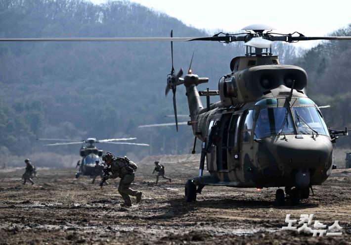 11일 경기도 파주시 법원읍 무건리 훈련장에서 '한미 연합 공중강습 훈련'이 열려 수리온 헬기에서 내린 한미 장병들이 목표지역 점령을 위해 전술기동 훈련을 하고 있다. 이날 훈련에는 한국군 90여 명, 미군100여 명이 참가했으며 수리온 6대가 동원됐다.