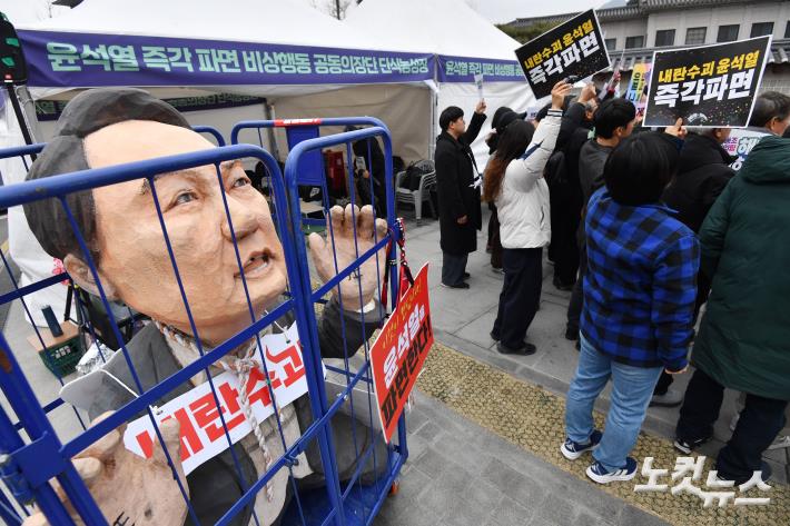 참여연대 등 시민사회단체원들이 12일 오전 서울 종로구 경복궁 서십자각 앞 단식농성장에서 내란수괴 윤석열 파면 촉구 참여연대 시국선언 기자회견을 하고 있다.