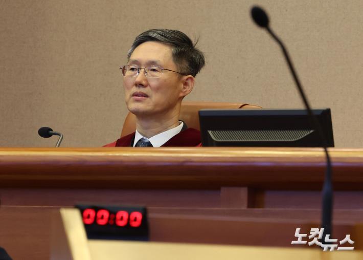 박성재 법무부 장관에 대한 탄핵심판 첫 변론기일인 18일 오후 서울 종로구 헌법재판소 대심판정에서 문형배 헌법재판소장 직무대행 앞으로 초시계가 보이고 있다.