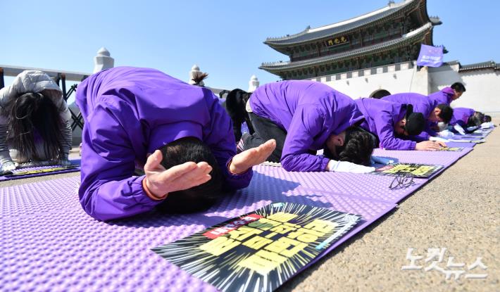 10.29 이태원참사 유가족협의회·시민대책회의 관계자들이 19일 오후 서울 종로구 광화문 월대 인근에서 윤석열 대통령 파면 기원 159배를 하고 있다.