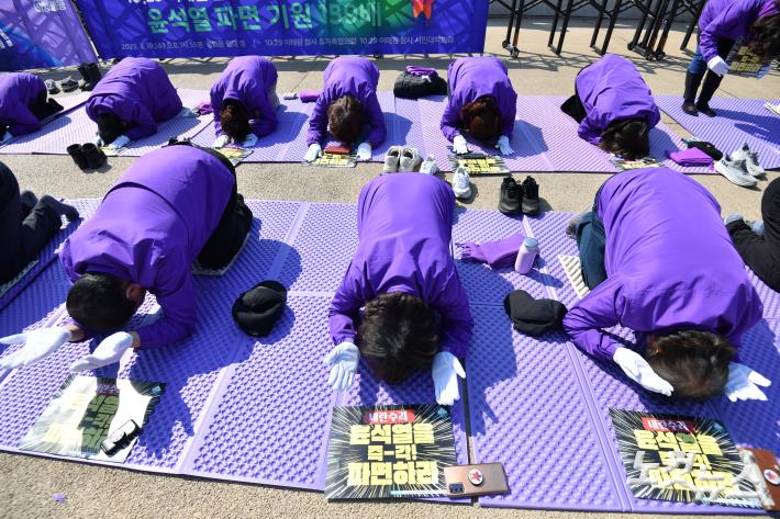 10.29 이태원참사 유가족협의회·시민대책회의 관계자들이 19일 오후 서울 종로구 광화문 월대 인근에서 윤석열 대통령 파면 기원 159배를 하고 있다.