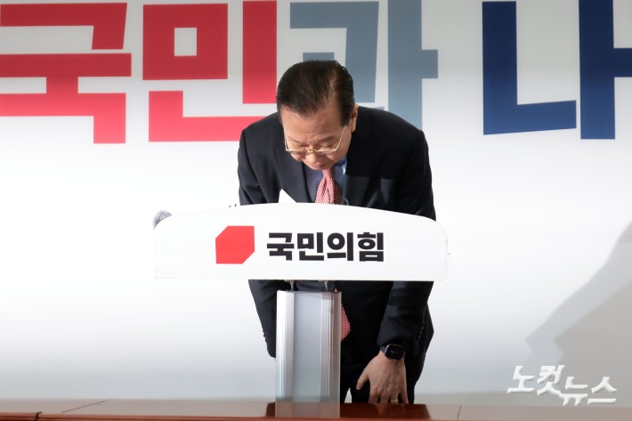 국민의힘 권영세 비상대책위원장이 4일 서울 여의도 국회에서 헌재의 윤석열 전 대통령 탄핵 인용 발표 직후 입장을 밝히는 기자회견을 하고 고개를 숙이고 있다.