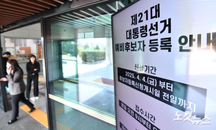 윤석열 전 대통령 파면으로 조기 대선의 막이 오른 가운데 7일 경기 과천시 중앙선거관리위원회에 21대 대통령 선거 예비후보자 등록 안내문이 나오고 있다.