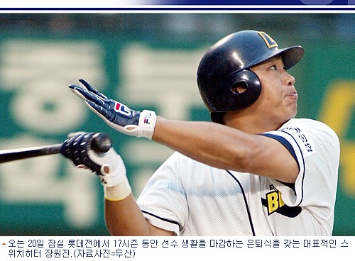○…전 두산 외야수 장원진(40)이 오는 20일 잠실 롯데전에서 은퇴식을 치른다. 두산은 이번 은퇴식을 ''소리없는 강자 장원진 Forever''로 명명했다.