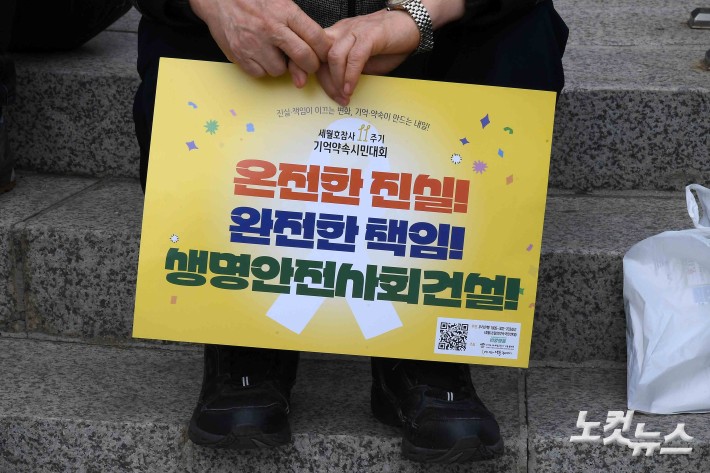 4·16 세월호참사 11주기인 16일 11주기 시민기억식이 진행된 서울시의회 본관 앞 세월호 기억공간을 찾은 한 시민이 진실규명을 촉구하는 피켓을 들고 있다. 지난 2014년 4월 15일 인천항에서 승무원 33명, 여객 443명을 태우고 제주항으로 향하던 세월호는 다음날인 16일 오전 10시 17분쯤 전남 진도군 병풍도 등대에서 약 4해리 떨어진 해상에서 전복됐다. 이 사고로 안산 단원고 학생들과 교사를 포함해 304명이 숨졌다.