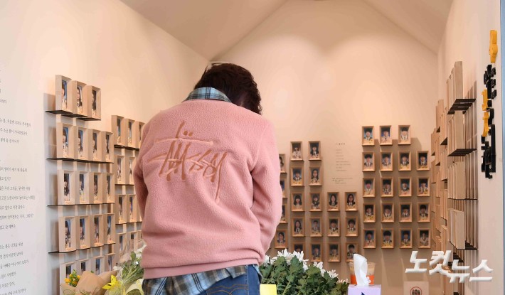 4·16 세월호참사 11주기인 16일 11주기 시민기억식이 진행된 서울시의회 본관 앞 세월호 기억공간을 찾은 한 시민이 고인들을 추모하고 있다. 지난 2014년 4월 15일 인천항에서 승무원 33명, 여객 443명을 태우고 제주항으로 향하던 세월호는 다음날인 16일 오전 10시 17분쯤 전남 진도군 병풍도 등대에서 약 4해리 떨어진 해상에서 전복됐다. 이 사고로 안산 단원고 학생들과 교사를 포함해 304명이 숨졌다.