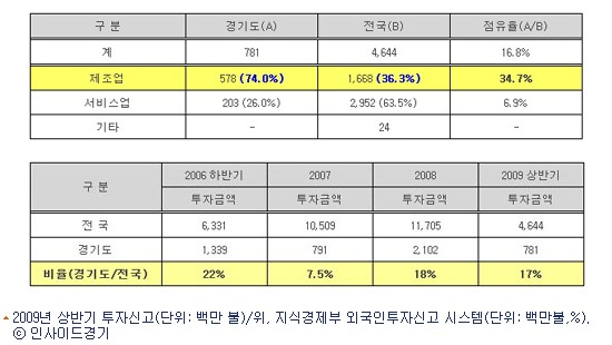 이처럼 도의 투자유치 사업은 꾸준히 증가세를 보이고 있다. 2006년 하반기부터 올해 상반기까지 전국 FDI 중 경기도가 차지하는 비중은 2007년도 7.5% 이후 2008년 18%, 2009년 17%로 급격한 상승세를 타고 있으며 총 50억불의 외국인 직접투자를 이끌어 냈다.