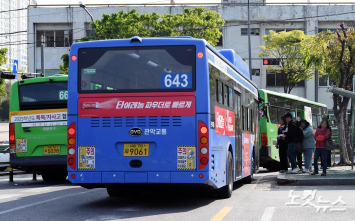 서울 시내버스 노사협상이 결렬되면서 노조가 준법 운행, 이른바 ‘준법투쟁’에 돌입한 30일 오전 서울 양천공영차고지 앞에서 시민들이 버스를 기다리고 있다. 파업이라는 최악의 상황은 피했지만, 준법 운행은 안전 규정을 준수하며 버스를 운행해 운행 간격이나 속도 등을 조절하는 방법으로 연착을 유도하는 방식이다.