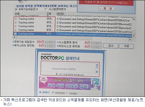 ◈ 돈주고 바이러스 잡았는데 컴퓨터 상태는 그대로부산경찰청 사이버수사대는 김 씨처럼 피해를 주장하는 고발이 계속되자 수사에 착수, ''닥터피씨 2008''이 가짜 백신 프로그램이라는 사실을 밝혀냈다.