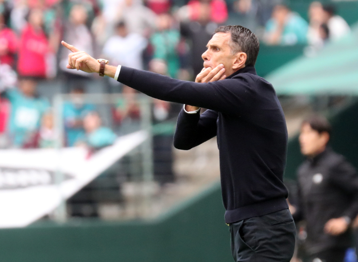 작전 지시하는 전북의 거스 포옛 감독. 연합뉴스 골잡이 전진우의 득점 여부도 안양전의 관전 포인트다. 3경기 연속골에 도전하는 전진우는 나란히 8골로 득점 1위 경쟁을 펼치는 주민규(대전)를 밀어내겠다는 각오를 다지고 있다.