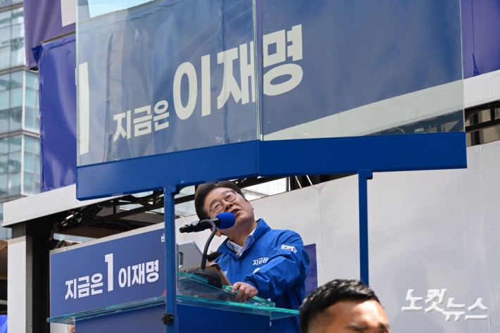 이재명 더불어민주당 대선 후보가 19일 오후 서울 용산역 광장에서 열린 집중유세에 참석해 방탄유리가 설치된 유세차 위에서 지지를 호소하고 있다.