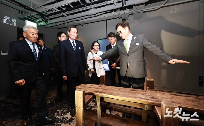 10일 서울 용산구 민주화운동기념관에서 열린 제38주년 6·10민주항쟁 기념식을 마친 우원식 국회의장, 우상호 대통령실 정무수석, 이재오 민주화운동기념사업회 이사장이 고문 도구를 살펴보고 있다.