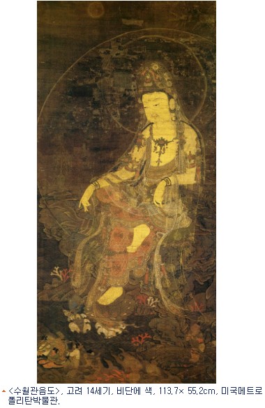 현재 <수월관음도>는 국내외에 40여점이 전한다.미국 메트로폴리탄박물관이 소장하고 있는 이 <수월관음도>는 고려시대에 유행한 수월관음도의 기본구도를 따랐으나, 화면 하단에서 선재동자가 관음보살쪽으로 이동하였고 그 자리에 용왕과 권속으로 추정되는 인물들이 등장하여 관음에게 경배하는 점이 다르다. 투명한 베일과 섬세한 문양의 표현, 화려하면서도 은은한 채색법은 고려불화의 우수성을 잘 보여준다.