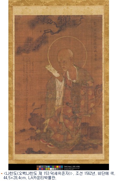 LA카운티박물관에 소장중인 이 <나한도>는 명종의 어머니인 문정왕후(1501~1565)가 나라의 평안과 왕의 무병장수 및 자손의 번영을 위해 발원하여 1562년에 제작한 오백나한도 중 하나이다. 소나무 아래에 있는 존자는 두루마리로 된 경책을 읽고 있고, 붉은 옷과 신, 귀걸이 등 화려한 치레를 걸쳤다.