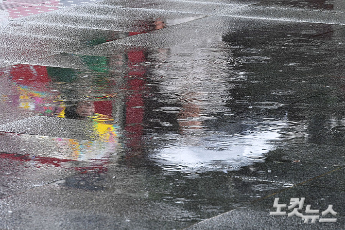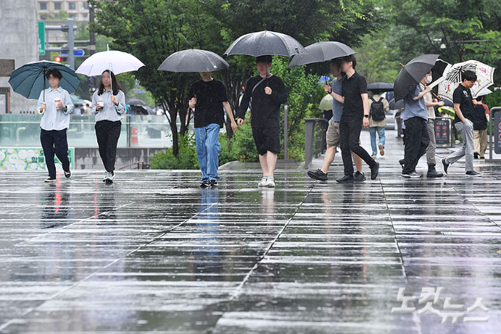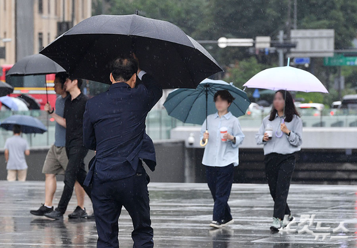 올 여름 본격적인 장마가 시작된 20일 오전 서울 종로구 광화문 광장에서 우산을 쓴 시민들이 발걸음을 재촉하고 있다.