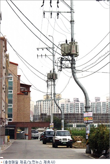 충북 청주·청원지역을 다니다보면 그 동안 눈에 익던 하늘을 찌를 듯이 일자로 쭉 뻗은, 단순히 기능을 강조하다보니 ''''멋''''이라고는 찾아 볼 수 없는 철근 전봇대가 아닌 휘어진 전봇대를 간간히 만날 수 있다.