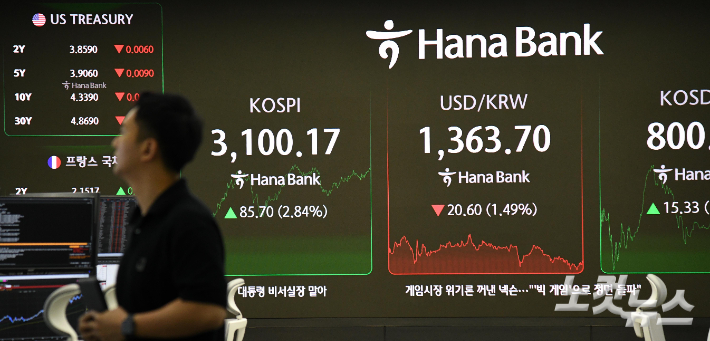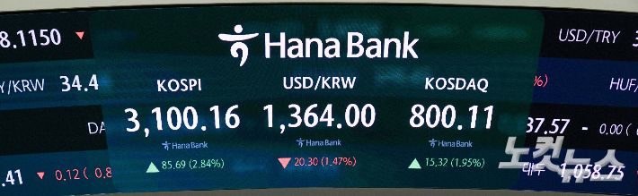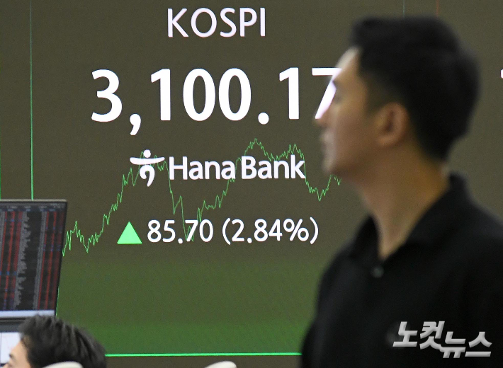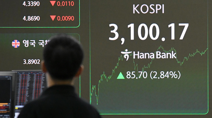 24일 서울 중구 하나은행 딜링룸 전광판에 코스피 지수가 표시되고 있다. 이날 코스피 지수는 상승 랠리를 이어가며 장중 3100선을 돌파했다. 코스닥 지수도 800선을 넘어섰다 .코스피가 3100선을 넘어선 것은 지난 2021년 9월 28일(3134.46) 이후 약 3년 9개월 만이다.