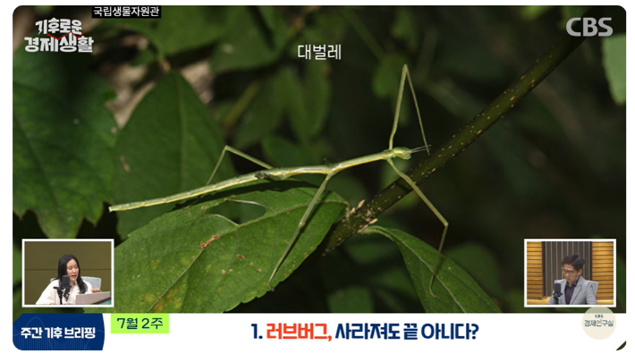 ◇ 최서윤> 그렇습니다. 그런데 여기서 끝내기엔 궁금한 게 남아있잖아요. 새로운 곤충이 또 대발생할 수 있다는 점이요. 환경부가 대발생 가능성이 높은 곤충들로 꼽고 있는 게 몇 개 있는데요. 8~9월에 대벌레의 대발생 가능성이 제기됐어요. 2020년에 우리나라에서 대발생했던 것 기억하실 거예요. 나뭇가지처럼 생겼는데 나뭇잎을 갉아 먹어서 문제가 됐던 그 대벌레가 서울, 경기 지역에서 다시 대규모로 출몰할 가능성이 있다고 합니다.