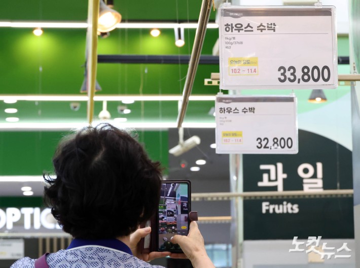 역대급 무더위와 이상고온이 작황과 어획량에 영향을 미치며 폭염에 따른 물가 상승을 뜻하는 '히트플레이션(폭염+인플레이션)' 현상이 나타나며 최근 일주일 새 수박 한 통이 3만원을 넘어서고, 배추나 시금치 같은 더위에 약한 채소 가격도 상승했다. 수박을 대체할 수 있는 다른 과일도 같은 이유로 나란히 가격이 오르고 있다. 백도 복숭아는 10개에 2만3천414원으로 지난해보다 12% 가까이 올랐고, 포도 역시 약 25% 올랐다. 16일 서울 서초구 하나로마트 양재점에서 한 시민이 수박가격을 스마트폰 카메라로 촬영하고 있다.