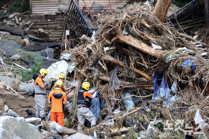 20일 새벽 쏟아진 물 폭탄에 경기 가평군 조종면 일대는 쑥대밭이 됐다. 21일 오전에도 복구가 더디게 진행되며 수마가 할퀴고 간 자리에 많은 나무와 토사들이 남겨져 있다. 경찰과 소방 당국은 가평 지역에서 발생한 실종자 4명을 찾기 위해 이틀째 수색 작업을 하고 있다. 가평 조종면에는 20일 오전 3시 30분을 전후해 시간당 76㎜의 폭우가 쏟아지는 등 이날 하루 누적 강수량 200㎜를 기록하는 물폭탄이 쏟아졌다.