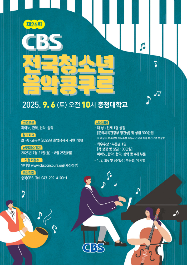 '제26회 CBS 전국청소년음악콩쿠르'가 9월 6일 오전 10시 충북 청주시 충청대학교에서 열린다.