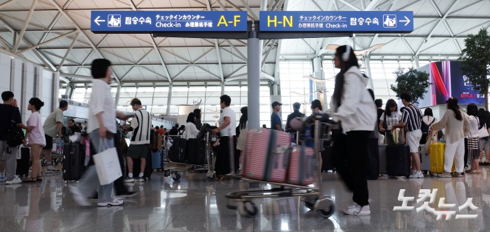 본격적인 여름 휴가철이 시작된 25일 오전 인천공항 1터미널이 여행객으로 붐비고 있다. 인천국제공항공사와 여행업계는 이번 하계 성수기(7월 25일~8월 10일) 약 387만 2000여 명이 인천공항을 이용할 것으로 예측했다. 일평균 여객 수는 22만 7000여 명이다.