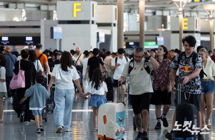 본격적인 여름 휴가철이 시작된 25일 오전 인천공항 1터미널이 여행객으로 붐비고 있다. 인천국제공항공사와 여행업계는 이번 하계 성수기(7월 25일~8월 10일) 약 387만 2000여 명이 인천공항을 이용할 것으로 예측했다. 일평균 여객 수는 22만 7000여 명이다.
