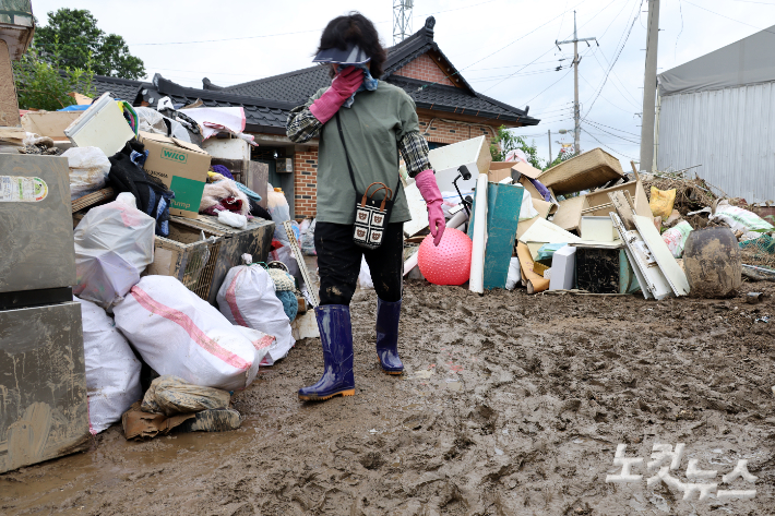 퍼내고 씻어내도 흙탕물만…비 그친 뒤 수해 복구 구슬땀 20일 충남 아산시 염치읍 수해 피해마을 주민들과 자원봉사자들이 피해복구 작업을 하고 있다. 400㎜가 넘는 기록적인 강수에 하천물이 불어났고, 마침 만조가 겹쳐 아산만으로 물이 빠져나가지 못하면서 피해를 더 키웠다. 아산=윤창원 기자