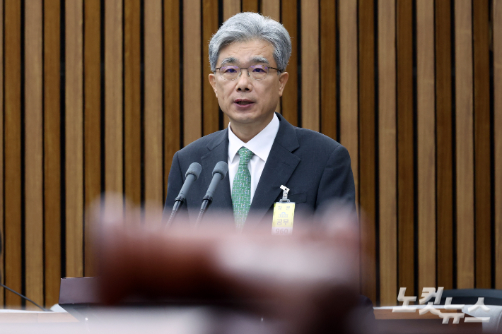 김상환 헌재소장 후보자 "정치의 사법화, 사법의 정치화, 늘 의식" 김상환 헌법재판소장 후보자가 21일 서울 여의도 국회에서 열린 인사청문회에서 모두발언을 하고 있다. 김 후보자는 모두발언을 통해 "헌재는 주권자인 국민으로부터 권한을 위임받았다"며 "국민 신뢰 없이 헌재의 정당성은 있을 수 없다"고 말했다. 윤창원 기자