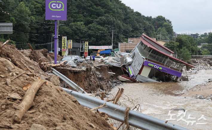 21일 경기 가평군 조종면 십이탄천 인근 한 건물이 집중호우로 인해 무너져 있다. 가평 조종면에는 전날 오전 3시 30분을 전후해 시간당 76㎜의 폭우가 쏟아지는 등 이날 하루 누적 강수량 200㎜를 기록하는 물폭탄이 쏟아졌다. 가평=박종민 기자