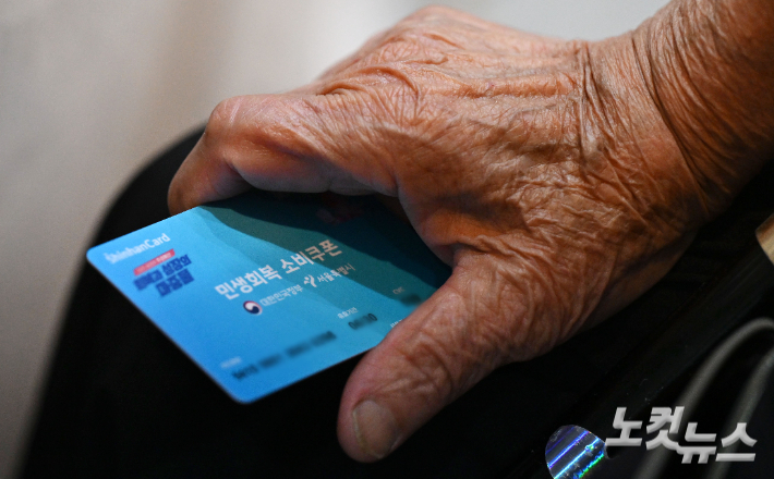 민생회복 소비쿠폰 신청이 시작된 21일 서울 동작구 대방동주민센터 작은도서관에서 한 어르신이 신청한 선불카드를 받고 있다. 황진환 기자