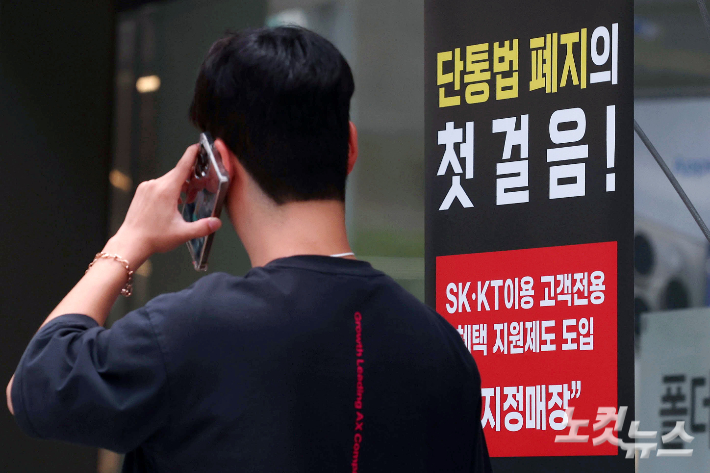 10년 넘게 국내 이동통신시장을 규제해 왔던 단통법(이동통신단말장치 유통구조 개선에 관한 법률)이 폐지된 22일 서울의 한 휴대폰 대리점에 단통법 폐지 홍보물이 내걸려 있다. 단통법 폐지로 이동통신사의 단말기 지원금 공시 의무가 사라지고 15% 한도로 제한됐던 공시지원금 상한도 없어지게 됐다. 앞으로 이동통신사는 '공통 지원금' 형태로 보조금을 지급하며, 유통점은 이와 무관하게 자율적으로 추가 보조금을 책정할 수 있게 된다. 류영주 기자