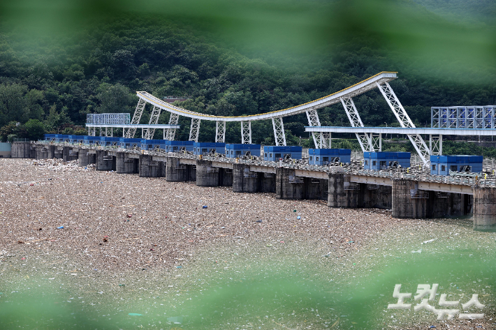 23일 지난 극한 호우로 떠내려 온 부유 쓰레기가 경기 하남시 팔당댐 수면을 뒤덮고 있다. 경기도 수자원본부와 하남시 등에 따르면 폭우로 팔당댐 상류에 유입된 부유 쓰레기가 1천t 이상인 것으로 추정됐다. 하남=박종민 기자