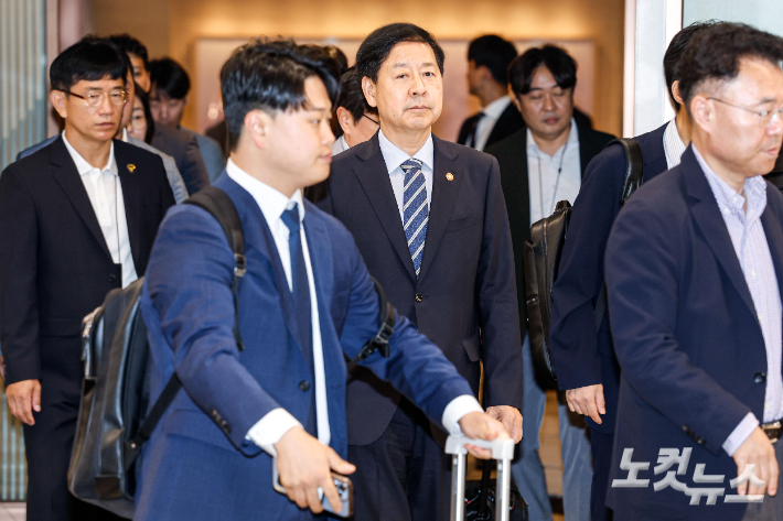 김정관 산업부 장관, 방미길…관세 부과 전 총력전 김정관 산업통상자원부 장관이 대미 통상 협상과 관련, 23일 인천국제공항을 통해 미국 워싱턴으로 출국하고 있다. 한미 무역협상을 위해 취임 후 첫 방미길에 나선 김 장관은 "한미간 산업 및 에너지 분야 협력이 한단계 업그레이드될 수 있는 포지티브 섬의 결과를 도출할 수 있도록 총력을 다하겠다"고 밝혔다. 인천공항=박종민 기자