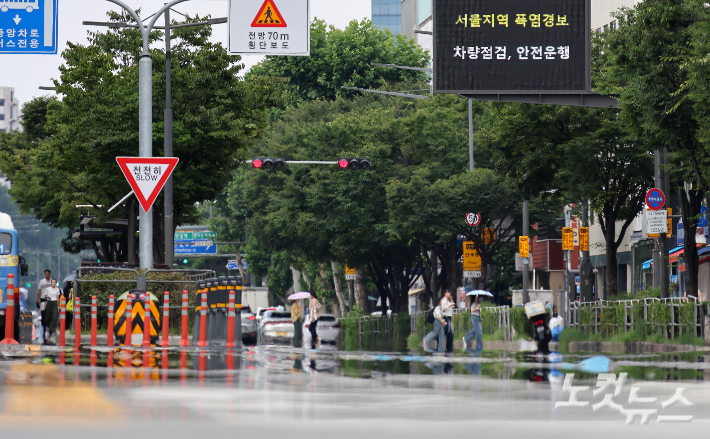 서울 전역에 폭염경보가 발효된 24일 서울 도심 전광판에 폭염경보 알림이 표시되고 있다. 폭염경보는 최고 체감온도 35도를 넘는 상태가 이틀 이상 계속되거나 더위로 큰 피해가 예상될 때 내려진다. 박종민 기자