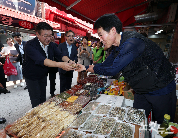 민생회복 소비쿠폰 사용 홍보에 나선 윤호중 행정안전부 장관이 24일 오후 서울 금천구 현대시장을 방문해 견과류를 구입하고 있다. 황진환 기자