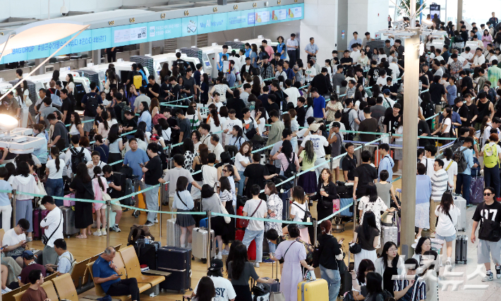 여름 휴가철 본격 시작…인천공항 이용객 약390만명 본격적인 여름 휴가철이 시작된 25일 오전 인천공항 1터미널이 여행객으로 붐비고 있다. 인천국제공항공사와 여행업계는 이번 하계 성수기(7월 25일~8월 10일) 약 387만 2000여 명이 인천공항을 이용할 것으로 예측했다. 일평균 여객 수는 22만 7000여 명이다. 인천공항=황진환 기자