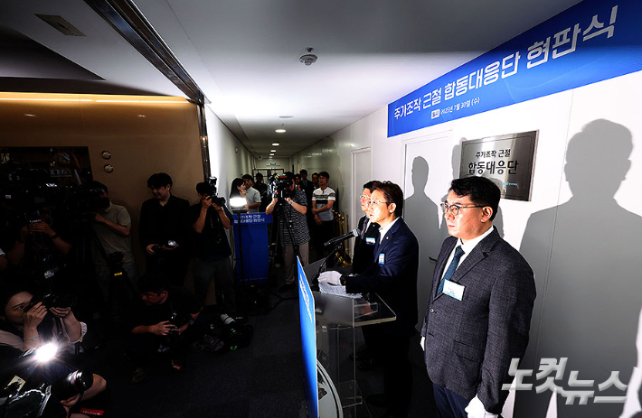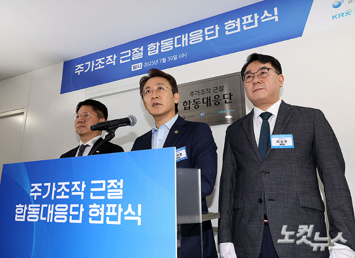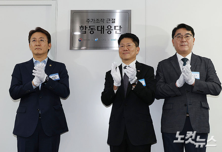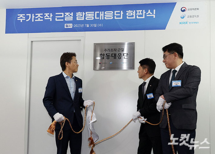 권대영 금융위원회 증권선물위원장(왼쪽부터), 김홍식 한국거래소 시장감시위원장, 이승우 금융감독원 부원장보 겸 합동대응단장이 30일 오전 서울 여의도 한국거래소에서 '주가조작 근절 합동대응단 현판식'을 갖고 있다. 권 위원장은 "주가조작 척결이 주식시장 신뢰의 시작"이라며 "주가조작범은 반드시 패가망신한다는 점을 보여줘, 올해를 주가조작 근절의 원년으로 만들겠다"고 말했다.