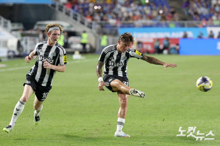 30일 수원월드컵경기장에서 열린 2025 쿠팡플레이 시리즈 팀 K리그와 뉴캐슬 유나이티드의 경기. 뉴캐슬 해리슨 애쉬비가 크로스 하고 있다.