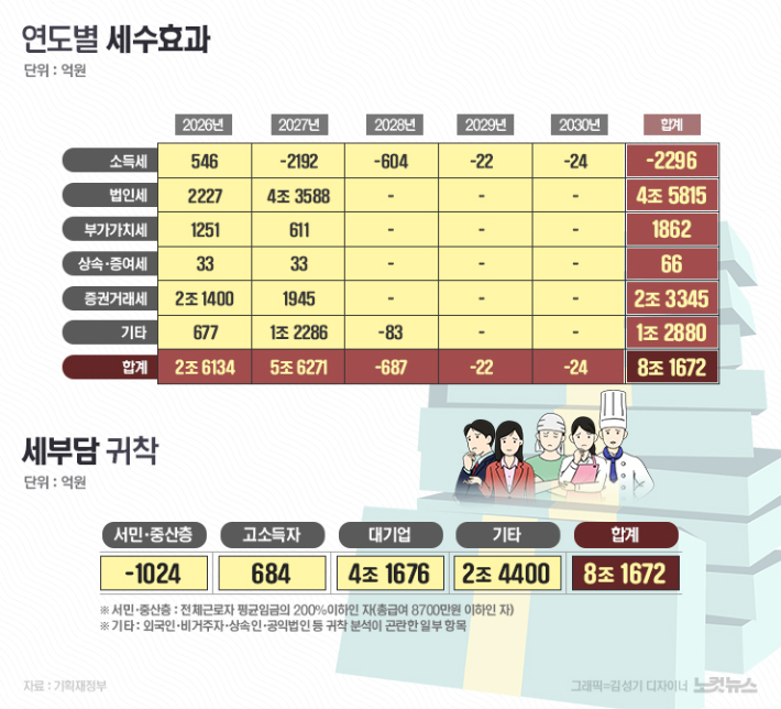 특히 눈에 띄는 지점은 세부담이 귀착되는 대상의 차이다. 정부는 이번 세제개편으로 서민·중산층의 세부담은 순액 기준 1024억 원 감소하는 반면, 고소득자(684억 원), 중소기업(1조 5936억 원), 대기업(4조 1676억 원), 외국인이나 상속인 등 기타(2조 4400억 원)에서 모두 세부담이 증가할 것으로 봤다.