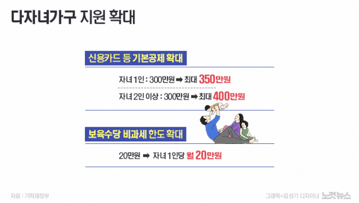 연합뉴스정부가 다자녀 가구에 대한 세부담을 완화하기 위해 신용카드 등 사용액에 대한 소득공제 기본한도를 자녀 수에 따라 상향 조정한다. 총 급여 7천만 원 이하 근로자는 자녀당 50만 원씩(최대 100만 원), 7천만 원 초과자는 자녀당 25만 원씩(최대 50만 원)을 추가 공제 받게 된다.