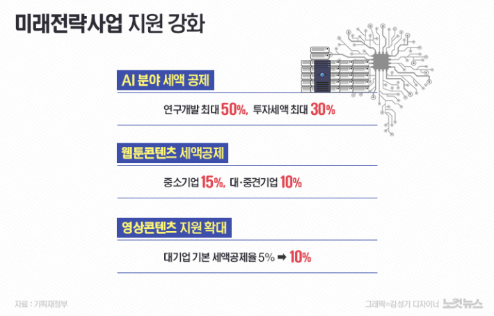정부는 웹툰 콘텐츠 제작비용에 대한 소득세와 법인세 세액도 공제하는 내용을 새롭게 담았다. '만화진흥에 관한 법률'에 따른 웹툰으로 인건비와 저작권료, 프로그램 비용 등 웹툰 등 제작에 든 비용이 대상이다. 공제율은 대기업과 중견기업은 10%, 중소기업은 15%다.
