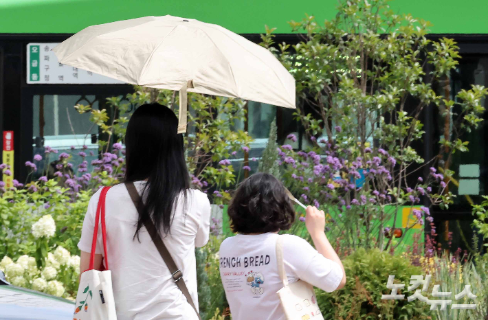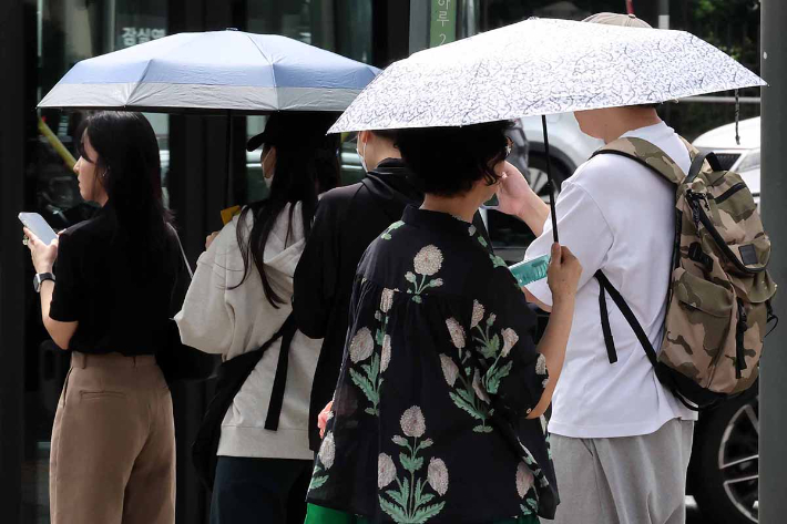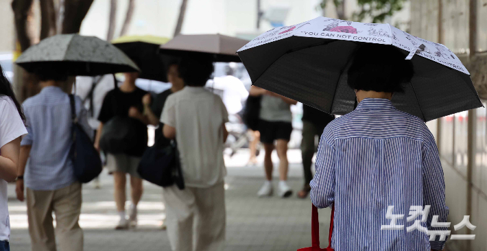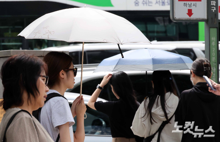 극한 폭염이 이어지는 31일 서울 도심에서 양산을 쓴 시민들이 발걸음을 옮기고 있다. 신세계백화점에 따르면 이번달 1일부터 29일까지 양산 매출은 전년 동기 대비 44.3% 늘었다. 같은 기간 롯데백화점은 60.0%, 현대백화점은 47.0% 증가했다.