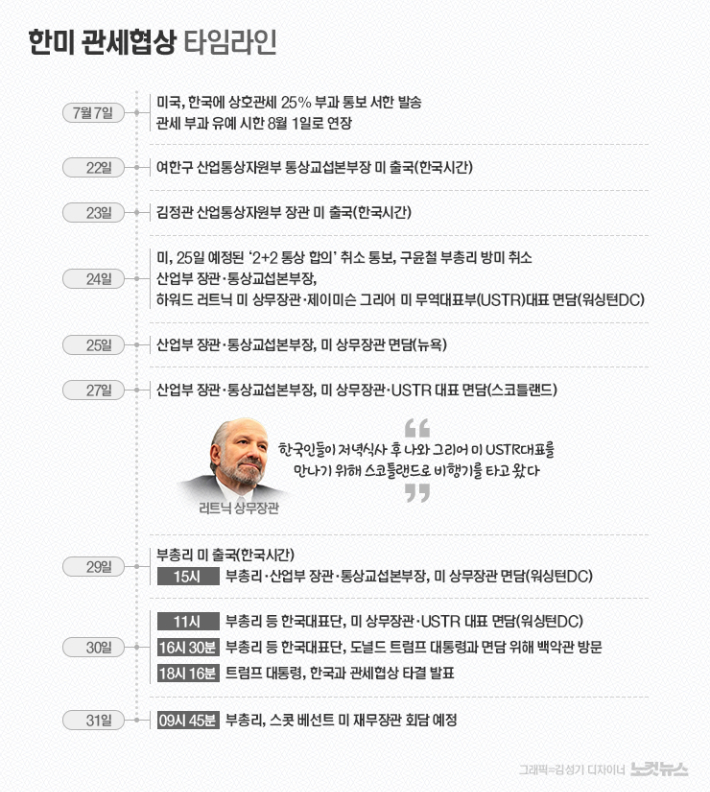 그러나 정부는 이후에도 협상의 '키맨'으로 꼽히는 하워드 러트닉 미 상무장관을 집중 마크하며 협상 시도를 이어갔다. 특히 김정관 산업부 장관은 취임 이틀 만에 미국으로 투입돼 여한구 통상교섭본부장과 본격적인 협상을 진행했다. 김 장관과 여 본부장은 24일 워싱턴DC에서 러트닉 장관을 만났고 25일에는 러트닉 장관의 뉴욕시 자택에서 협상을 이어갔다. 이중 25일 협상은 현지에서 잡은 일정으로, 이때부터 양국의 협상에 물꼬가 트인 것으로 분석된다.