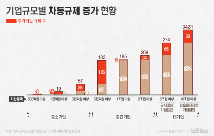 이들은 "중소기업을 졸업하면 적용받는 규제는 57개에서 183개로 3배 가까이 늘고, 중견기업을 벗어나면 209개에서 바로 274개까지 40% 늘어난다"며 "대외 불확실성이 커 기업성장을 담보하기 어려운 시기인 만큼 갈라파고스 규제, 역진적 규제들을 정비해 성장 유인을 키워나갈 때"라고 밝혔다.