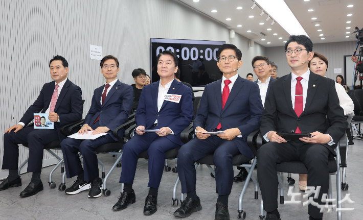 국민의힘 비전대회‥김·장 "대여투쟁" 안·조 "극우 절연" 주 "세대교체" 3일 오후 영등포구 국민의힘 중앙당사에서 열린 제6차 전당대회 당 대표 후보자 비전대회에서 참석한 후보들이 시작을 기다리고 있다. 국민의힘 당대표 후보들은 각각 "대여투쟁"과 "극우 단절"을 비전으로 내세우며 맞섰다. 왼쪽부터 장동혁, 조경태, 안철수, 김문수, 주진우 후보. 황진환 기자